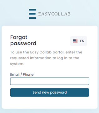 If the user has forgotten their password for logging into Easy Collab, they need to click “Forgot your password?” which opens a window (Error! Reference source not found.) where they can enter their phone number or email address. After that, they will receive a password via SMS or email, which will allow them to log into their account and a new password will be created.